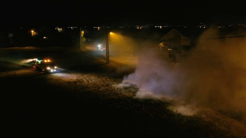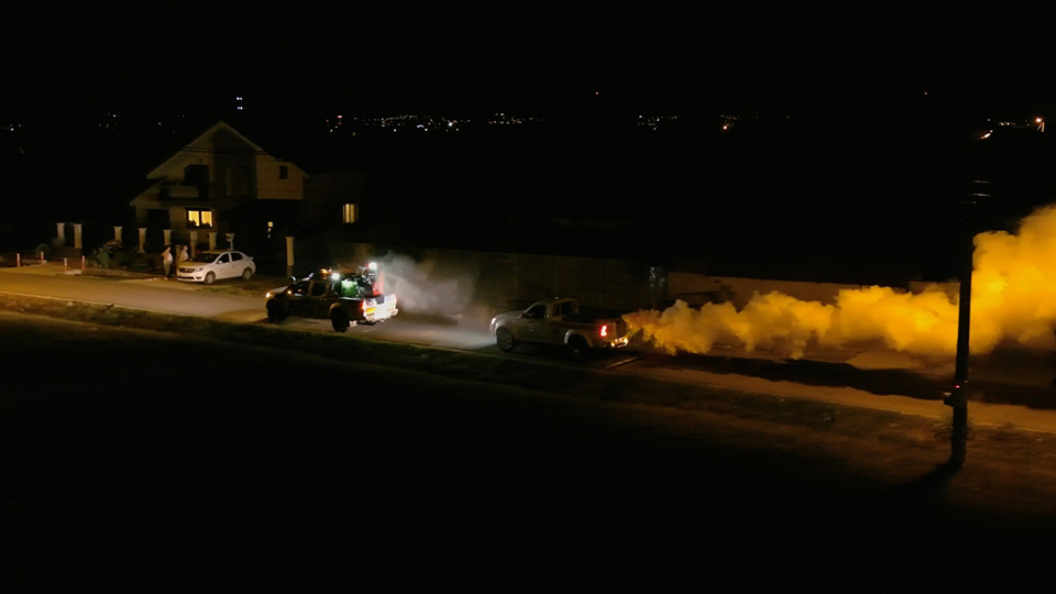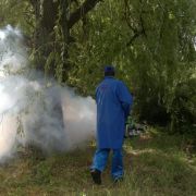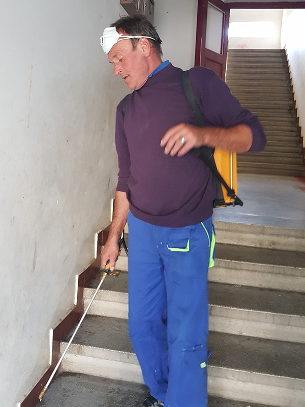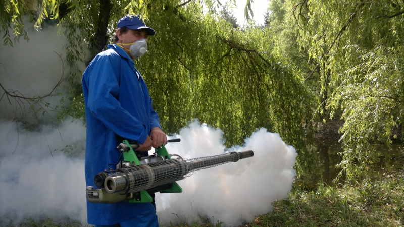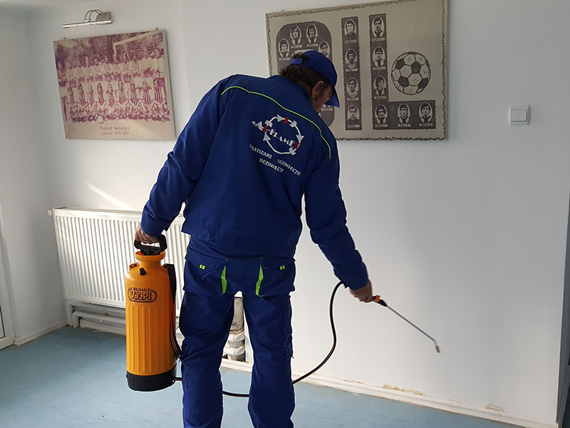 Procedeu: operatiunea de dezinsectie se face prin stropire cu atomizoare pe benzina sau pompe de mana, atat in spatii inchise, cat si in spatii deschise, insistandu-se asupra focarelor de infectie. Aceasta operatiune de dezinsectie se mai poate efectua si cu ajutorul fumigatiilor, substante solide, in care este impregnat insecticidul amestecat cu o substanta pirogena, prin ardere lenta se degaja gazul toxic, fum insecticid de mare eficacitate, insistandu-se asupra posibilelor focare.